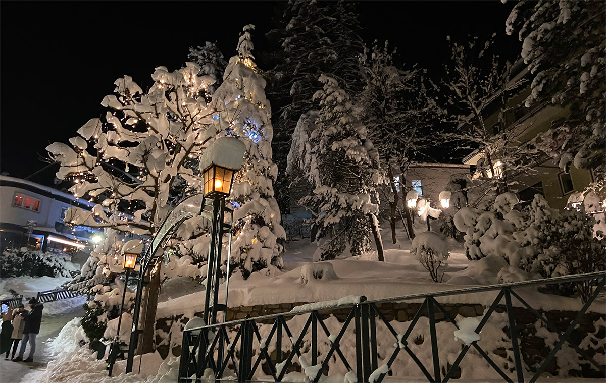 Na de historische stadstoer hadden we heerlijk gedineerd met de groep van deze persreis. Een aangenaam laatste avondmaal in een sprookjesachtige setting. Zo heerlijk om in de frisse berglucht te wandelen en de sneeuw onder je voeten te horen knisperen.
