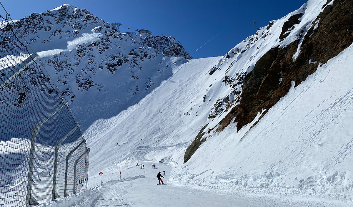 Sölden bestaand uit bijna 150 km aan pistes is min of meer verdeeld over de Gaislachkogl, de Giggijoch en de Rettenbach- en de Tiefenbachgletsjer. Wij hadden slechts één ochtend waarbij onze gids ons meenam naar Gaislachkogl, een deel van het skigebied wat wordt gezien als het meest uitdagende skigebied. Dat vonden wij zelf wel meevallen want er waren ook genoeg vriendelijke blauwe en rode pistes.