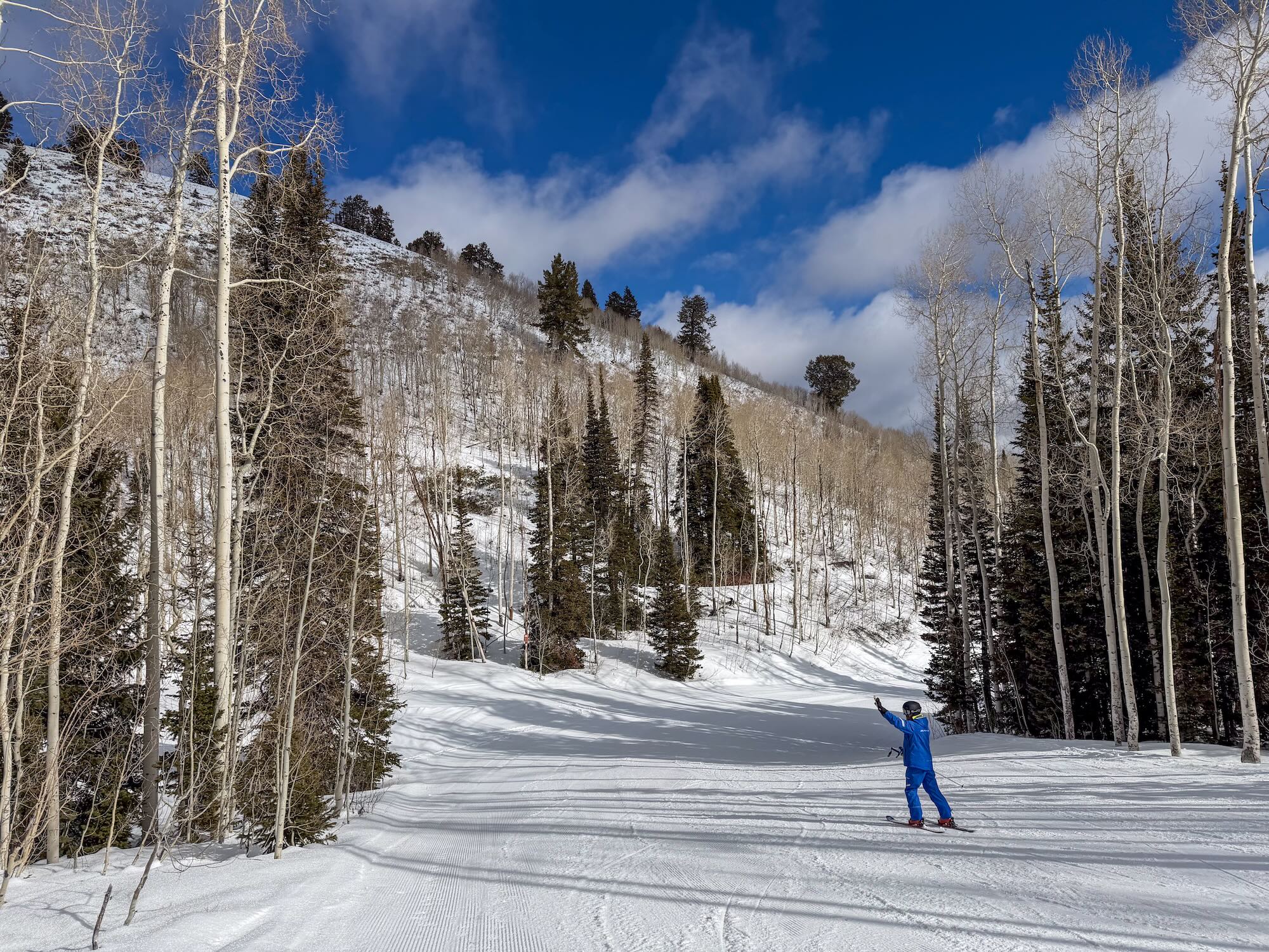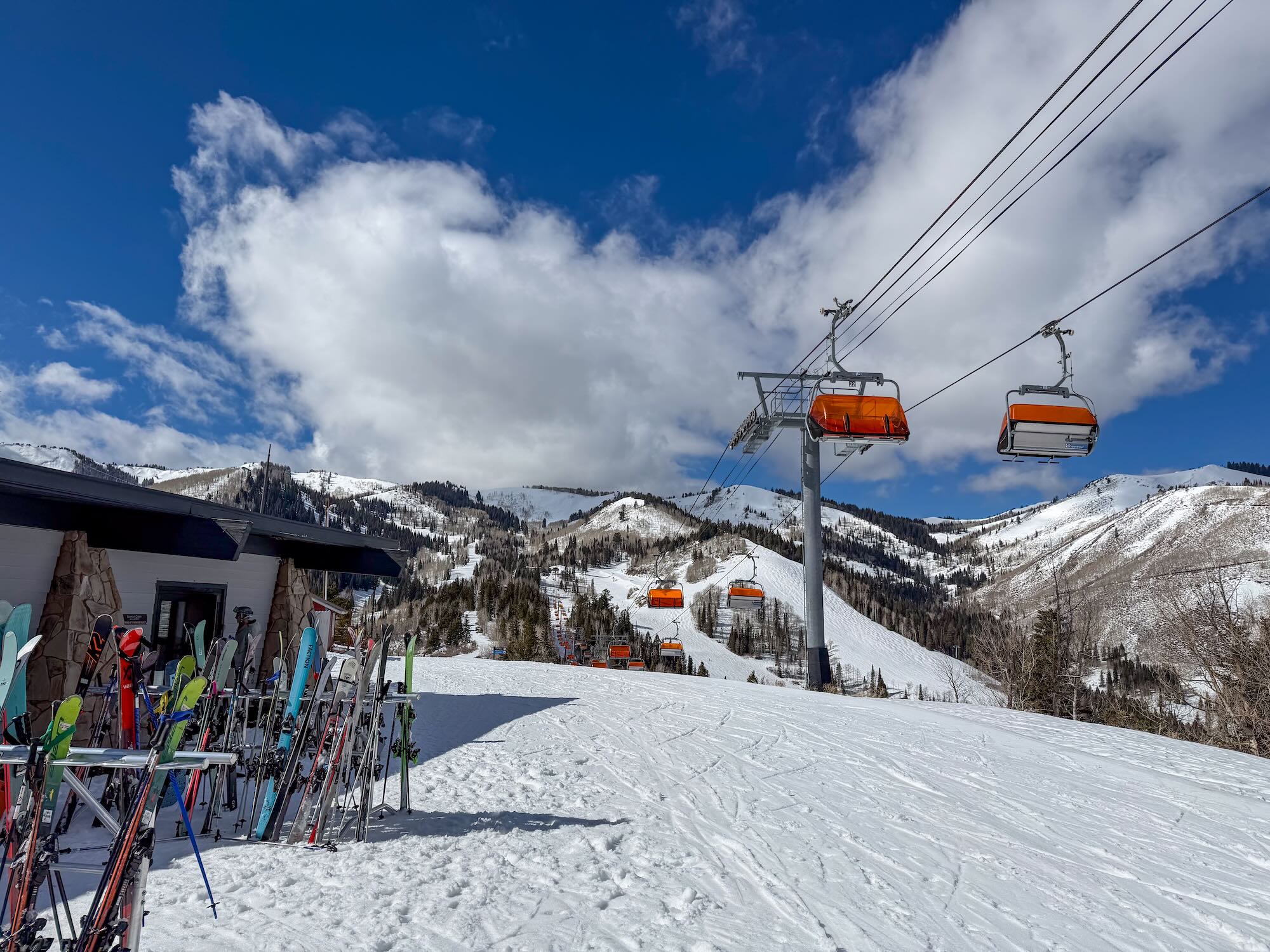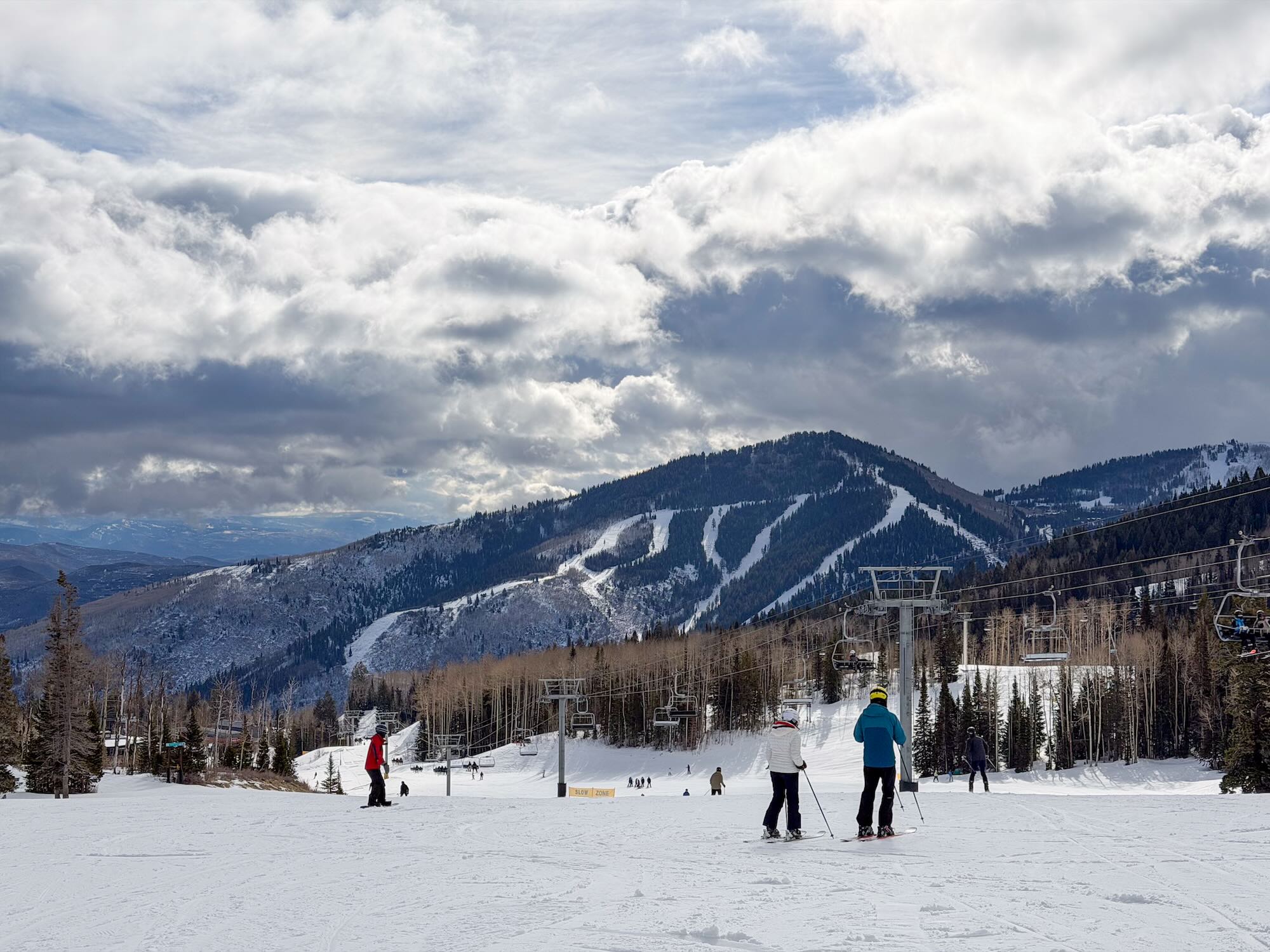 Vanaf ons hotel was het een ritje van slechts 10 minuten naar Canyons Village. Ondanks de grootte van het gebied was het hier in het dal opvallend rustig. Geen haast, geen rijen, maar een relaxte opstart zoals je die eigenlijk elke dag zou willen. Terwijl de eerste liften begonnen te draaien, hing er die typische spanning in de lucht: een nieuwe berg die nog helemaal ontdekt moet worden. Gelukkig hadden we een gids bij ons, waardoor we meteen de mooiste plekken van het gebied konden opzoeken zonder zelf te verdwalen.
