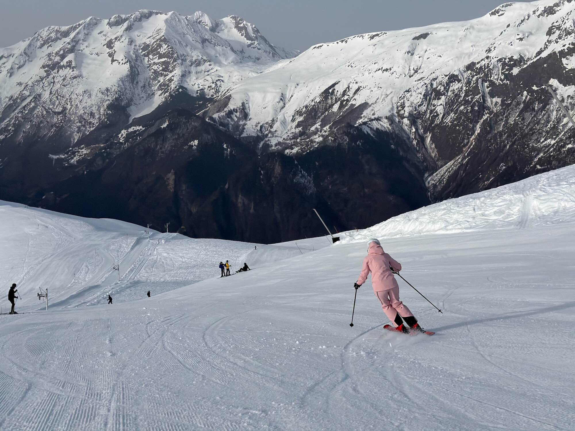 Uiteraard zetten we koers richting het hoogste punt van het skigebied: Pic Blanc (3330 meter). Het begint bijna afgezaagd te worden, maar ook hier is het uitzicht weer fenomenaal. Daarna volgt een van de bekendste afdalingen van het gebied: La Sarenne, een zwarte piste van maar liefst 16 kilometer lang. Het begin is steil en hier en daar zie je wat onzekere bochten, maar al snel wordt de piste breder en vriendelijker. Vanaf dat moment is het simpel: Dit. Is. Genieten.