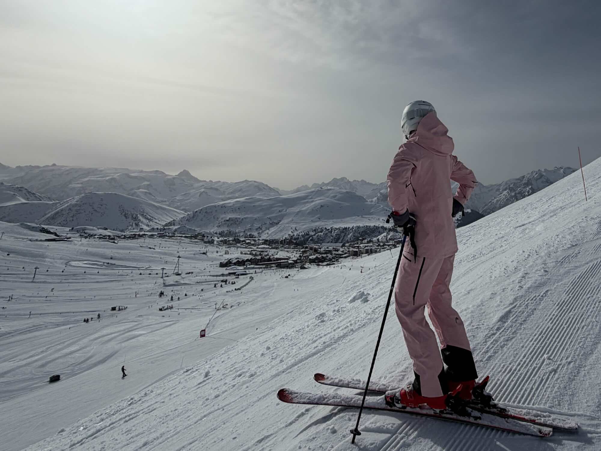 Vandaag gaan we op pad in het skigebied van Alpe d’Huez, goed voor zo’n 250 kilometer aan pistes. Vanuit Villard-Reculas sta je binnen no time (één sleeplift en één stoeltjeslift) midden in het grote en bekende wintersportdorp. Wat een verschil met ons rustige, knusse dorpje. Ook op de pistes merk je het meteen: het is hier een stuk drukker.